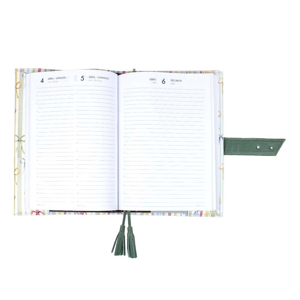 A agenda, diferente do Planner, tem uma página inteira para cada dia (exceto sábado e domingo), dividida por horários, das 08:00 até as 20:00, para você anotar todos os compromissos do dia. Ela ainda conta com calendários de 2023 e 2024, Planejamento Anual, Agenda de Telefones e um Controle de Gastos no começo de cada mês.