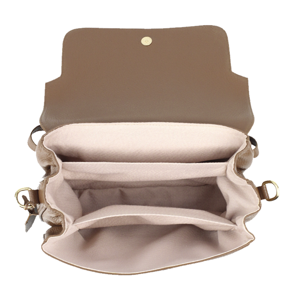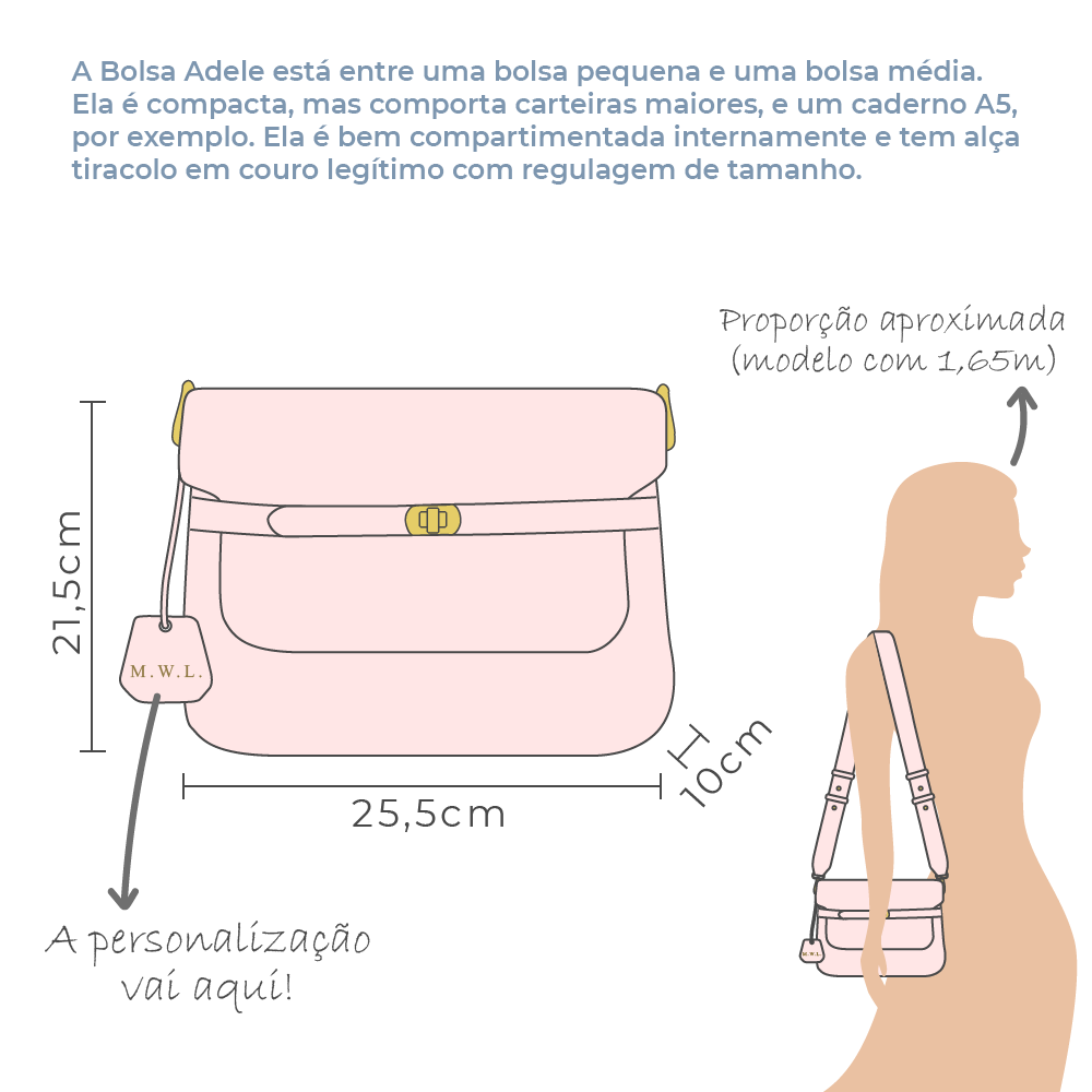 Uma bolsa elegante e charmosa! A bolsa Adele é dividida em 3 compartimentos internos, além de um bolso traseiro fechado com zíper. Ela pode ser personalizada com até 3 caracteres, entre letras e símbolos, que vão no mini tag que acompanha a bolsa.