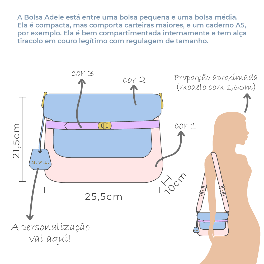 A bolsa Adele Colors é dividida em 3 compartimentos internos, além de um bolso traseiro fechado com zíper. Ela é confeccionada com couro legítimo de 3 cores diferentes, garantindo um encontro perfeito entre o clássico e o moderno. Ela pode ser personalizada com até 3 caracteres, entre letras e símbolos, que vão no mini tag que acompanha a bolsa.