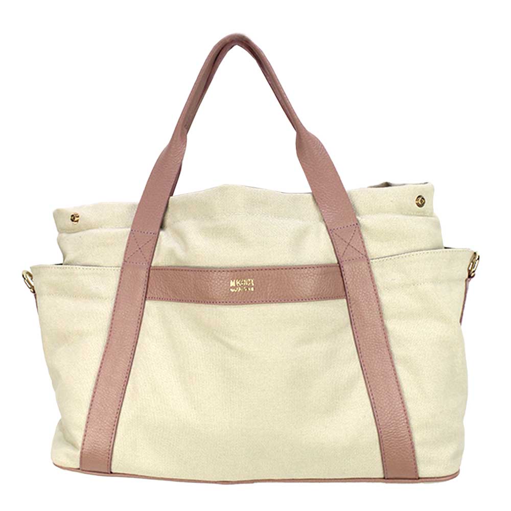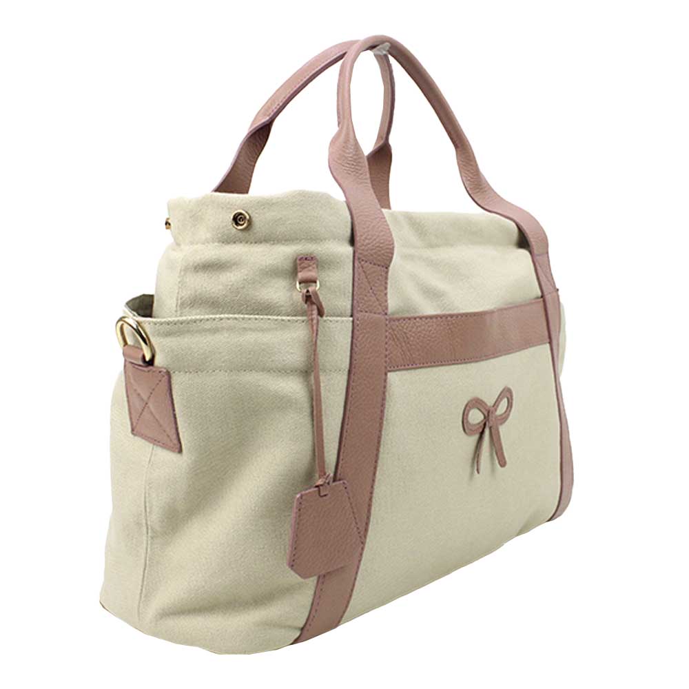 Uma bolsa super espaçosa e muito bem compartimentada, inclusive com bolsos externos, de fácil acesso. A Bolsa de Bebê é feita em algodão cru e toda forrada com tecido impermeável, facilitando a limpeza. A escolha dos tecidos foi pensada para garantir uma bolsa leve e maleável, que comporta todos os itens dos pequenos. Os acabamentos e detalhes são feitos em couro 100% legítimo.