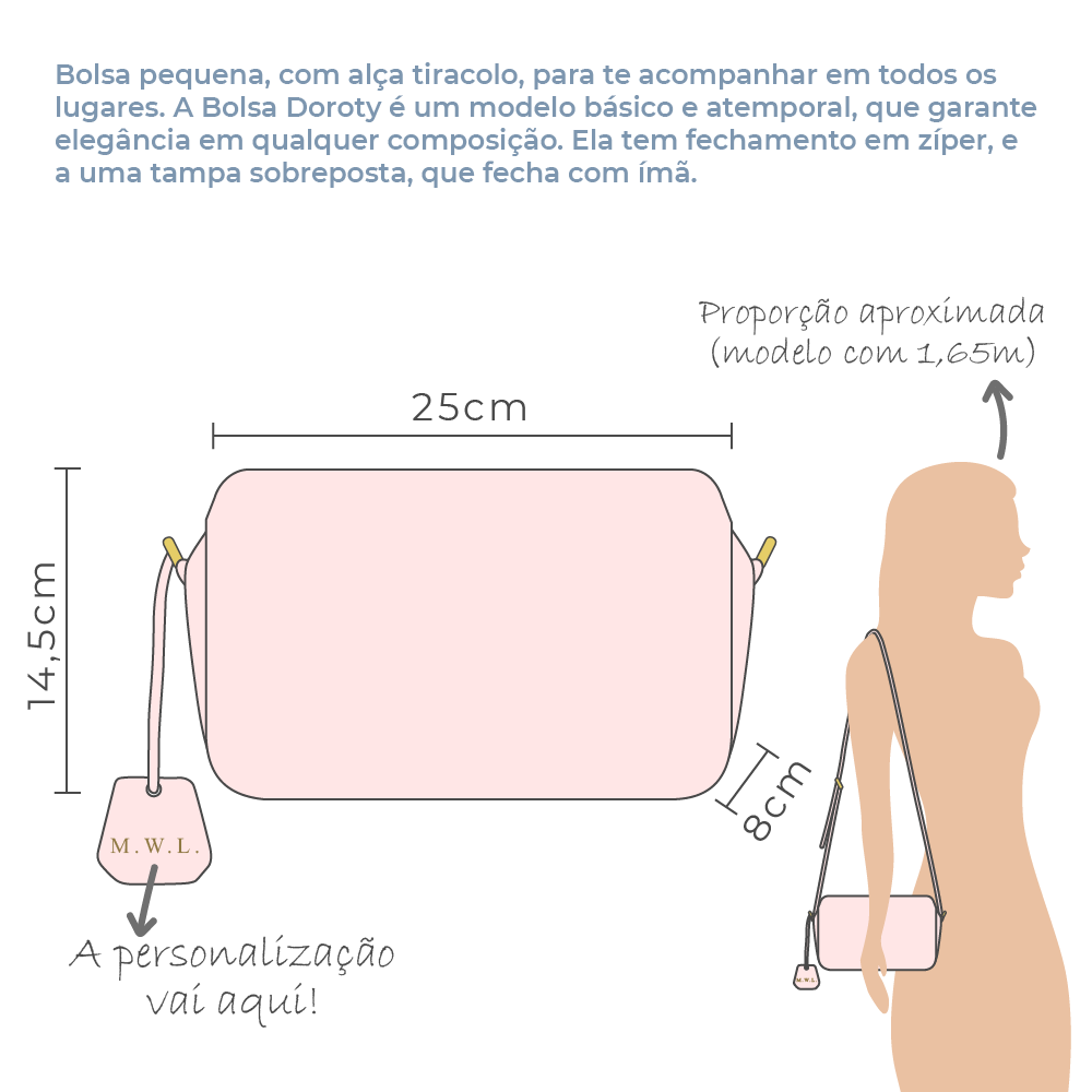 A Bolsa Dorothy é uma bolsa pequena, tiracolo, que transita super bem entre dia e noite. Básica, atemporal e super elegante, ela vem com mini tag que você pode personalizar com até 3 caracteres, entre letras e símbolos.