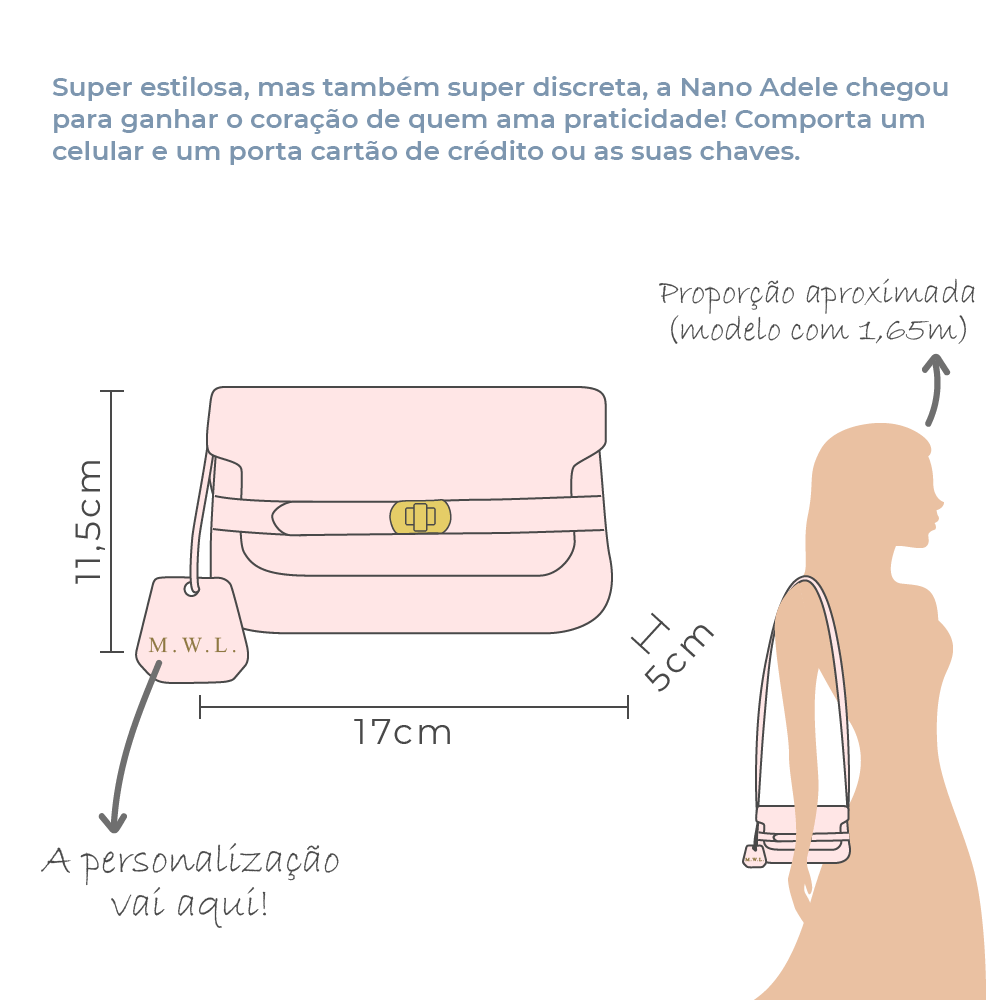 A Nano Adele é leve, discreta e acompanha o mini tag de bolsas Merci, que você pode personalizar com as suas iniciais.