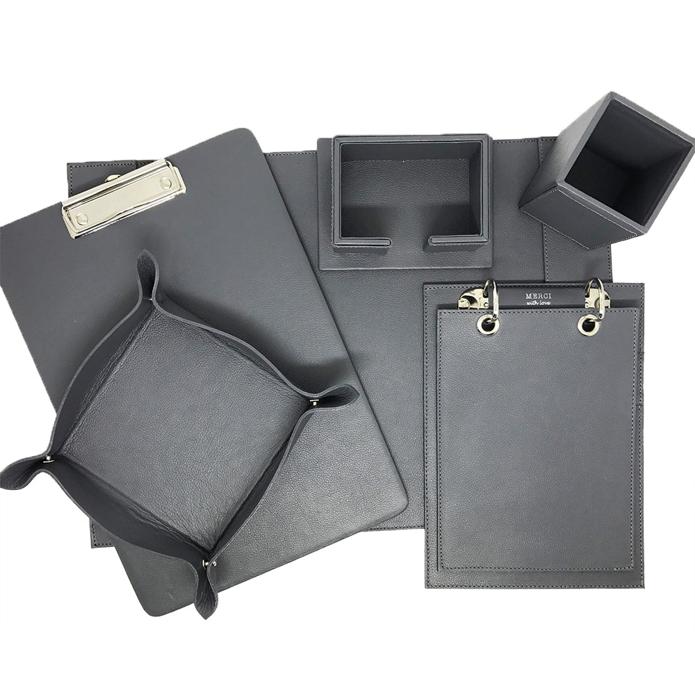 Porta treco, porta lápis, porta cartão de visita, prancheta, bloco de notas e risque rabisque.