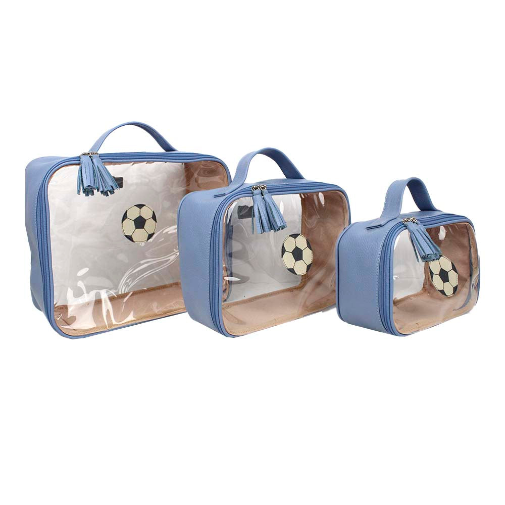 O kit da necessaire Crystal é composto por 3 necessaires feitas em couro 100% legítimo e vinil transparente. São ideais para quem gosta de viajar com as malas bem organizadas. São leves e super práticas! E ainda podem ser personalizadas com suas iniciais.