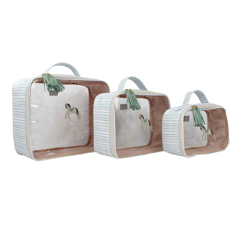 O kit da necessaire Crystal é composto por 3 necessaires feitas em couro 100% legítimo e vinil transparente. São ideais para quem gosta de viajar com as malas bem organizadas. São leves e super práticas! E ainda podem ser personalizadas com suas iniciais.