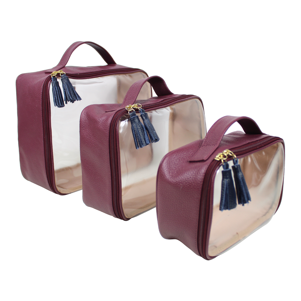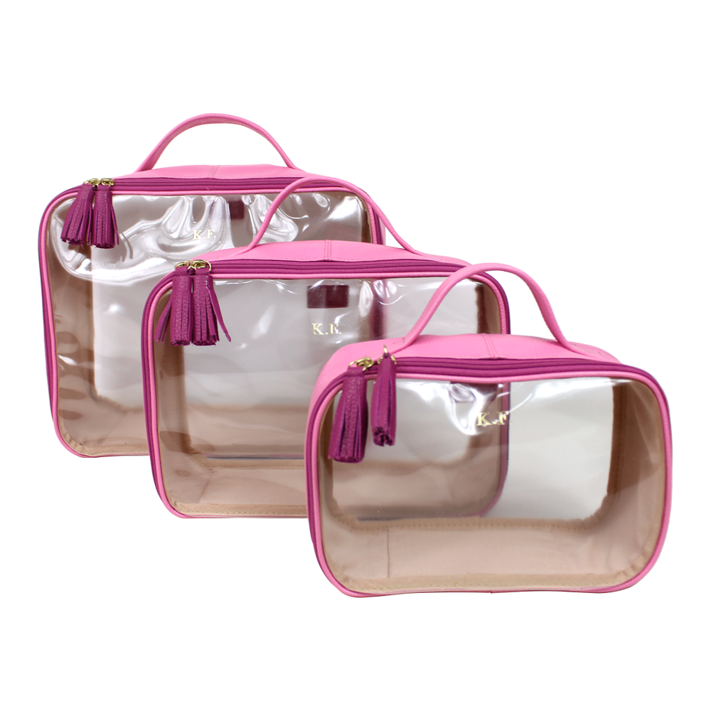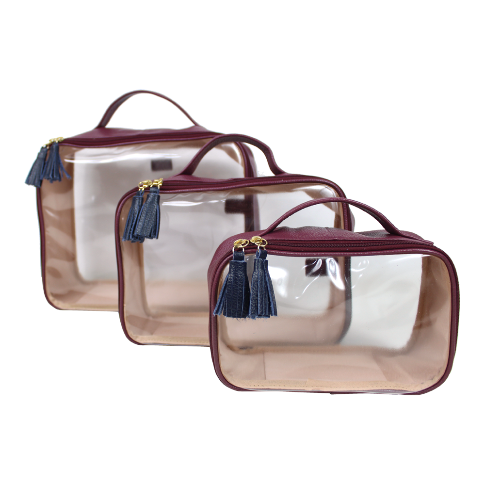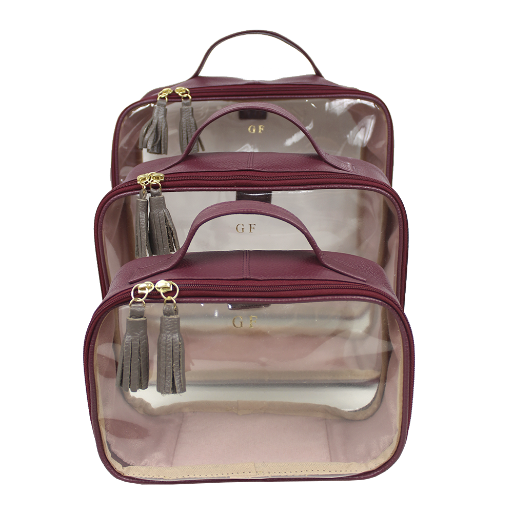 O kit da necessaire Crystal é composto por 3 necessaires feitas em couro 100% legítimo e vinil transparente. São ideais para quem gosta de viajar com as malas bem orgzanizadas. São leves e super práticas! E ainda podem ser personalizadas com suas iniciais.