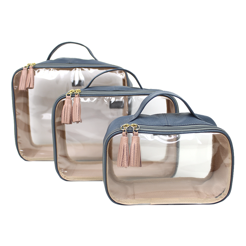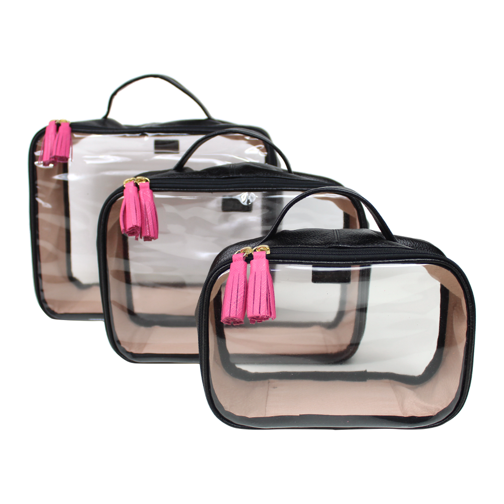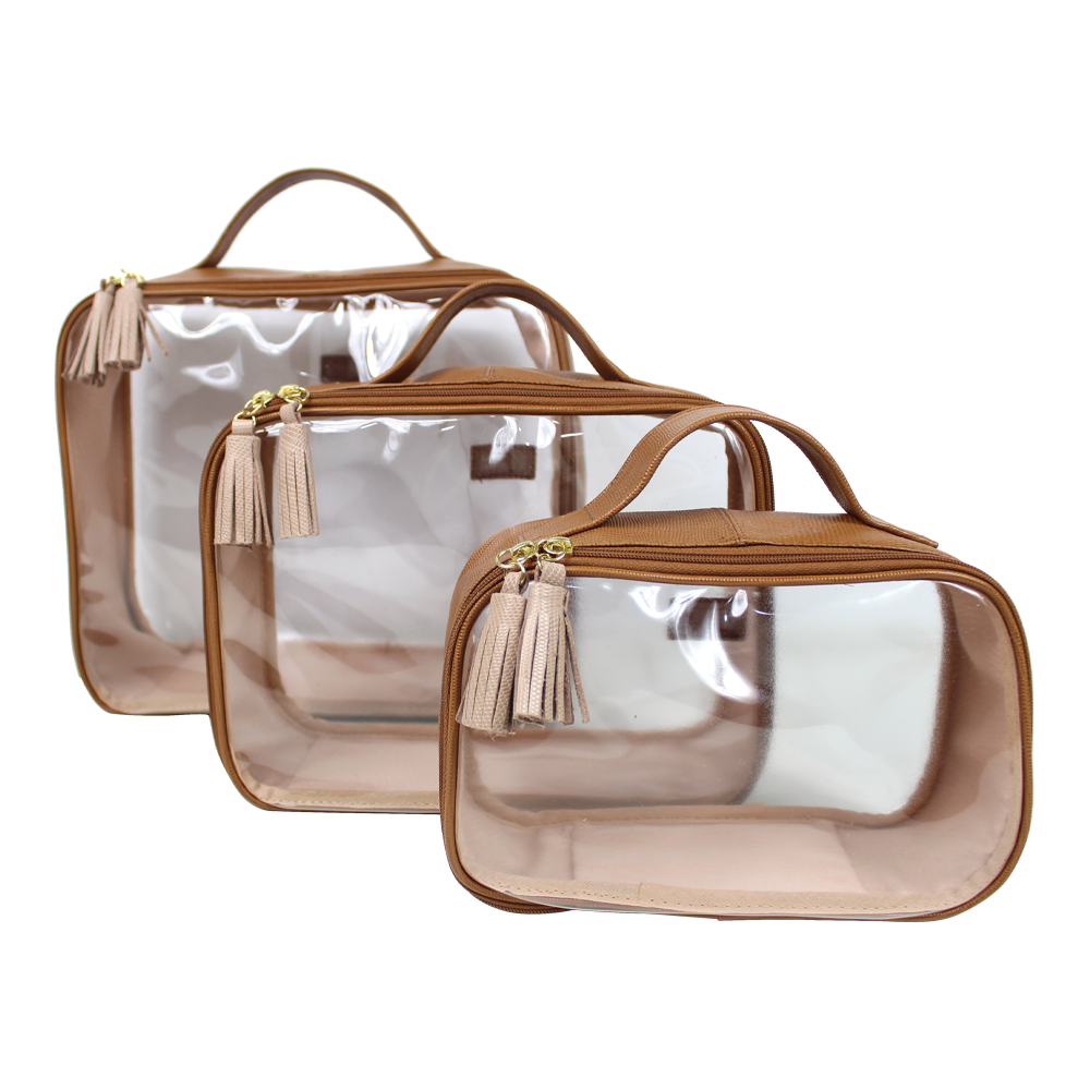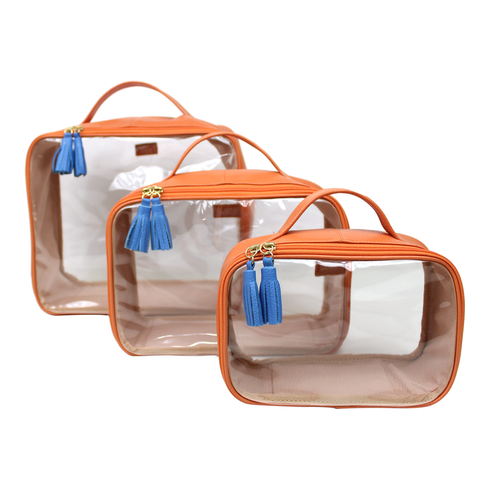 O kit da necessaire Crystal é composto por 3 necessaires feitas em couro 100% legítimo e vinil transparente. São ideais para quem gosta de viajar com as malas bem orgzanizadas. São leves e super práticas! E ainda podem ser personalizadas com suas iniciais.