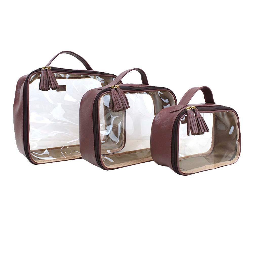 O kit da necessaire Crystal é composto por 3 necessaires feitas em couro 100% legítimo e vinil transparente. São ideais para quem gosta de viajar com as malas bem orgzanizadas. São leves e super práticas! E ainda podem ser personalizadas com suas iniciais.
