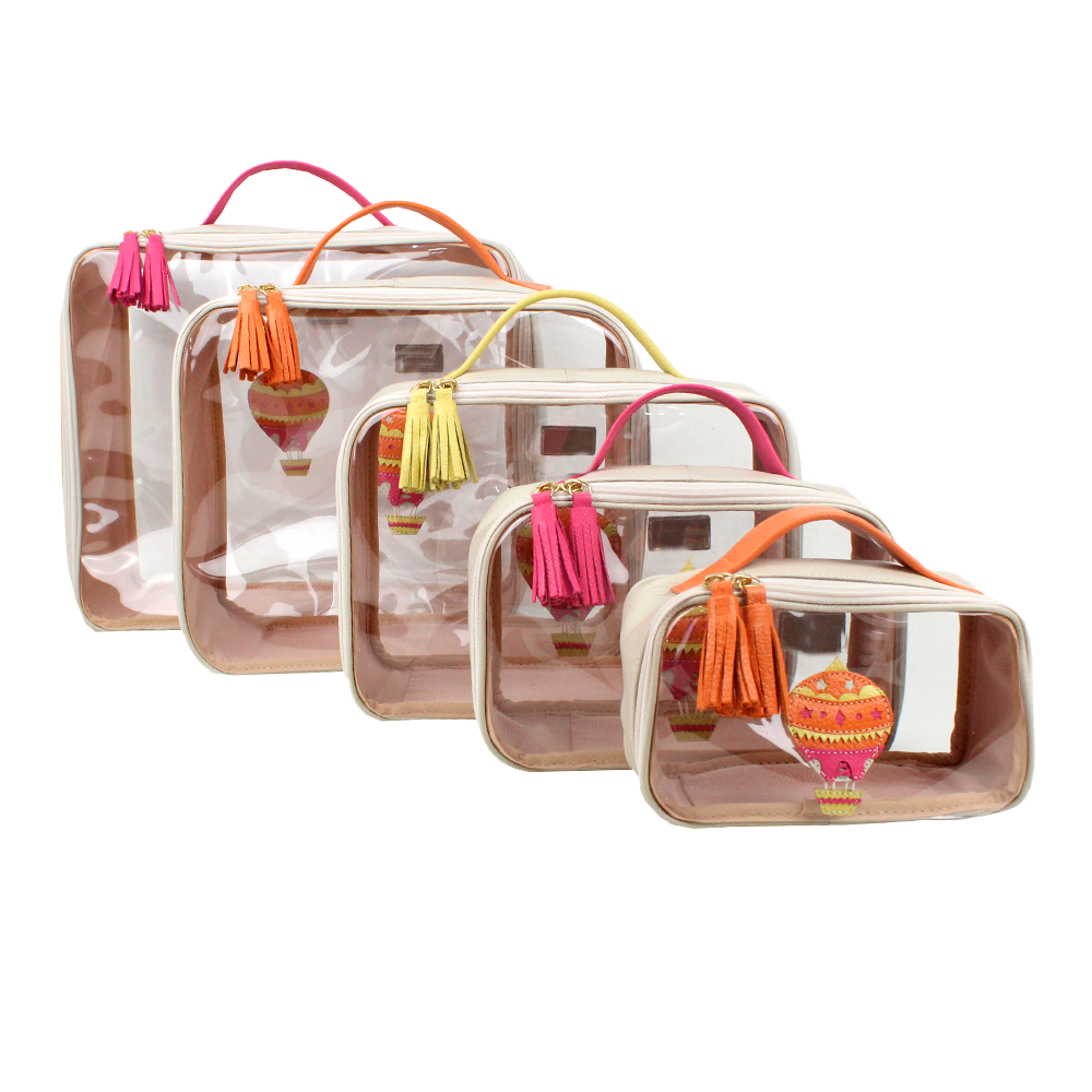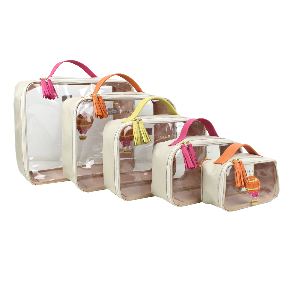 O kit da necessaire Crystal Gelato é composto por 3 necessaires feitas em couro 100% legítimo e vinil transparente. São ideais para quem gosta de viajar com as malas bem organizadas. São leves e super práticas! E ainda podem ser personalizadas com suas iniciais.