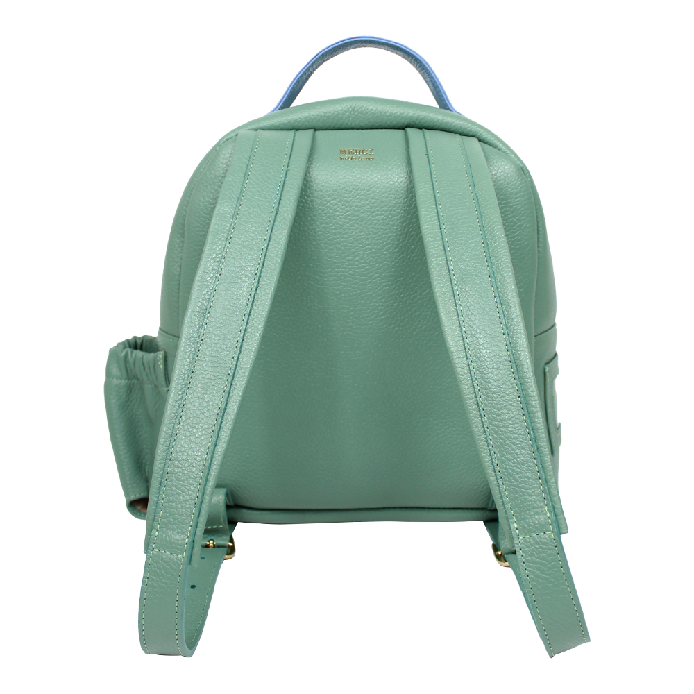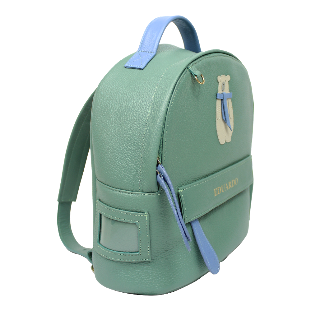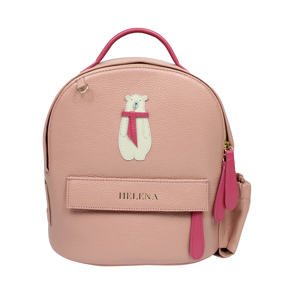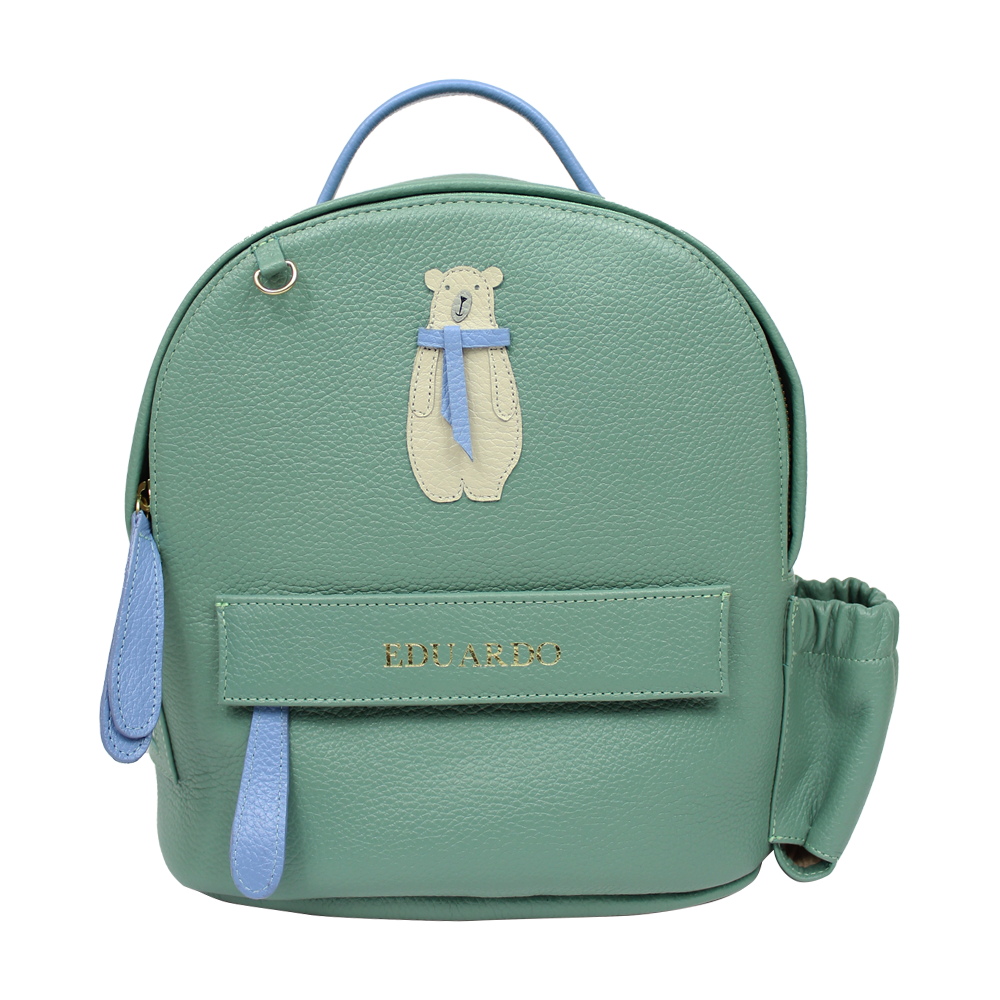 Possui alças reguláveis, é toda feita em couro 100% legítimo e pode ser personalizada com as iniciais da criança. Acompanha mini trocador com tema pespontado.