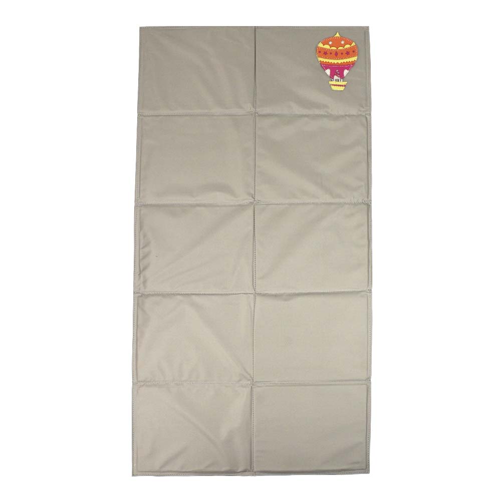 Externamente possui bolso com zíper, compartimento para garrafinha ou mamadeira, local para identificação (para dados da criança), argolinha de metal para prender recipiente de álcool em gel ou algo que seja também útil para a criança ou de uso constante dela.