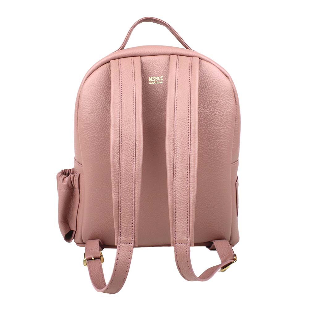Possui alças reguláveis, é toda feita em couro 100% legítimo e pode ser personalizada com as iniciais da criança. Acompanha mini trocador com tema pespontado.