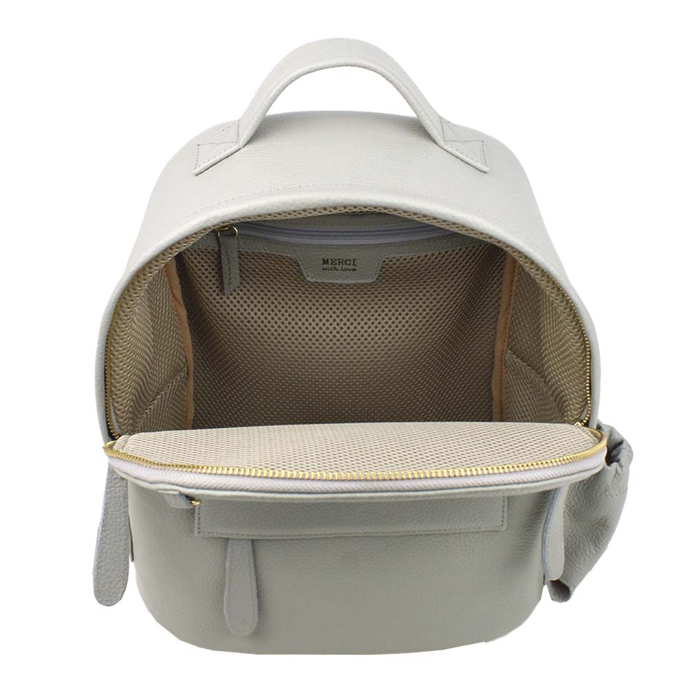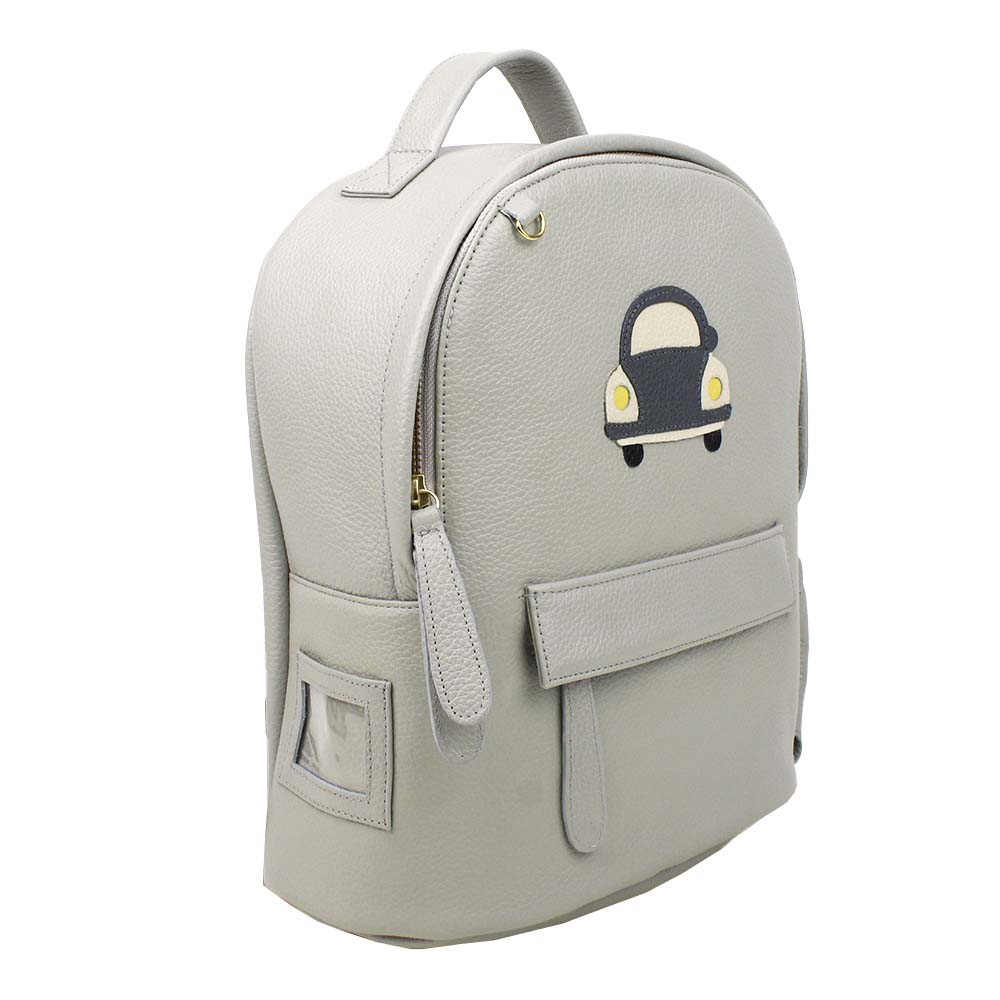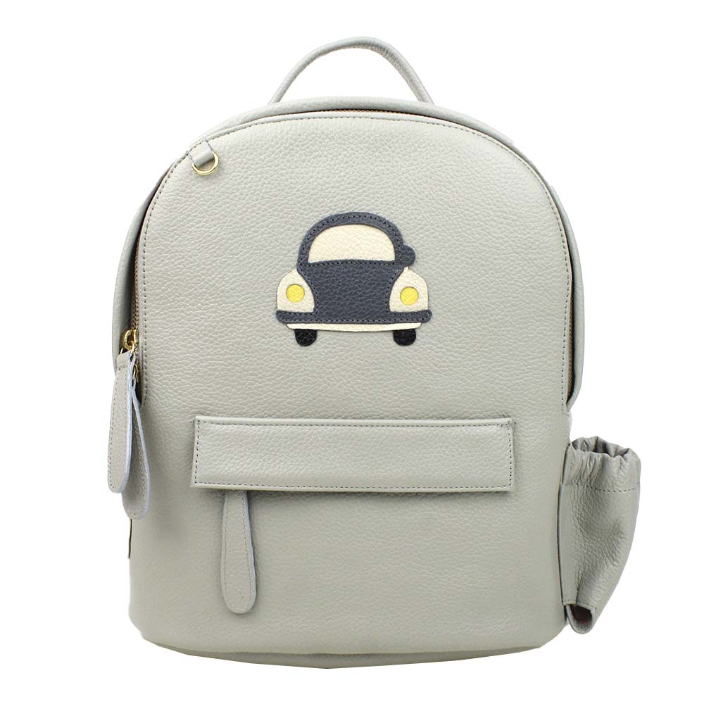 Possui alças reguláveis, é toda feita em couro 100% legítimo e pode ser personalizada com as iniciais da criança. Acompanha mini trocador com tema pespontado.