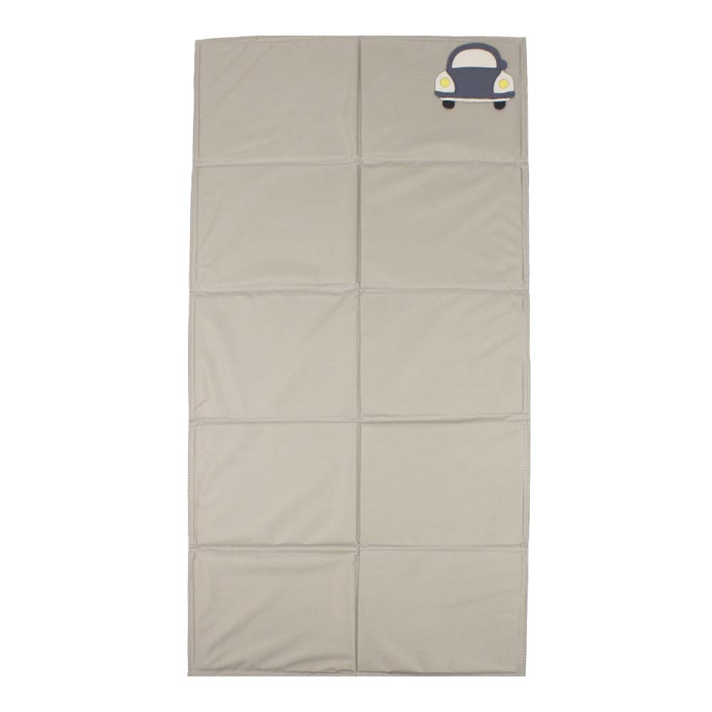 Externamente possui bolso com zíper, compartimento para garrafinha ou mamadeira, local para identificação (para dados da criança), argolinha de metal para prender recipiente de álcool em gel ou algo que seja também útil para a criança ou de uso constante dela.