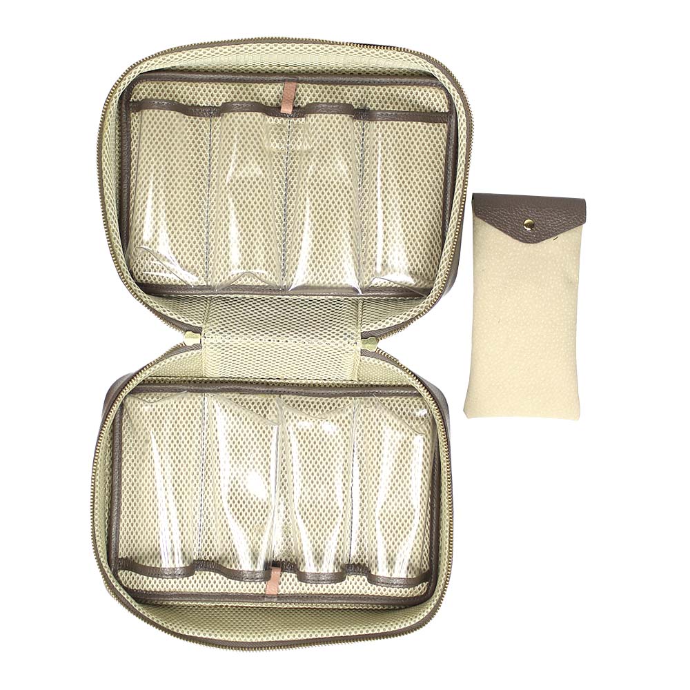 A necessaire porta óculos foi desenvolvida para carregar seus óculos de maneira prática e segura. Comporta até 8 óculos e possui compartimentos removíveis o que permite que a necessaire seja usada quando necessário também pra outra finalidade. É toda feita em couro 100% legítimo e em tela especial com espuma, ideal para proteção. Pode ser personalizada com seu nome ou com suas iniciais.