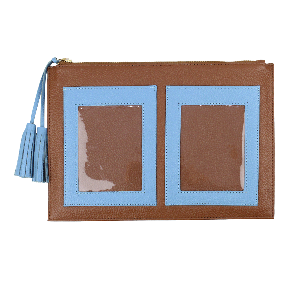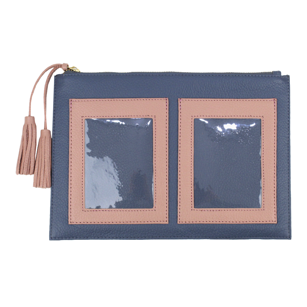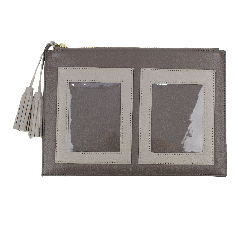 Porta documentos tipo necessaire com espaço exterior para dois porta passaportes.