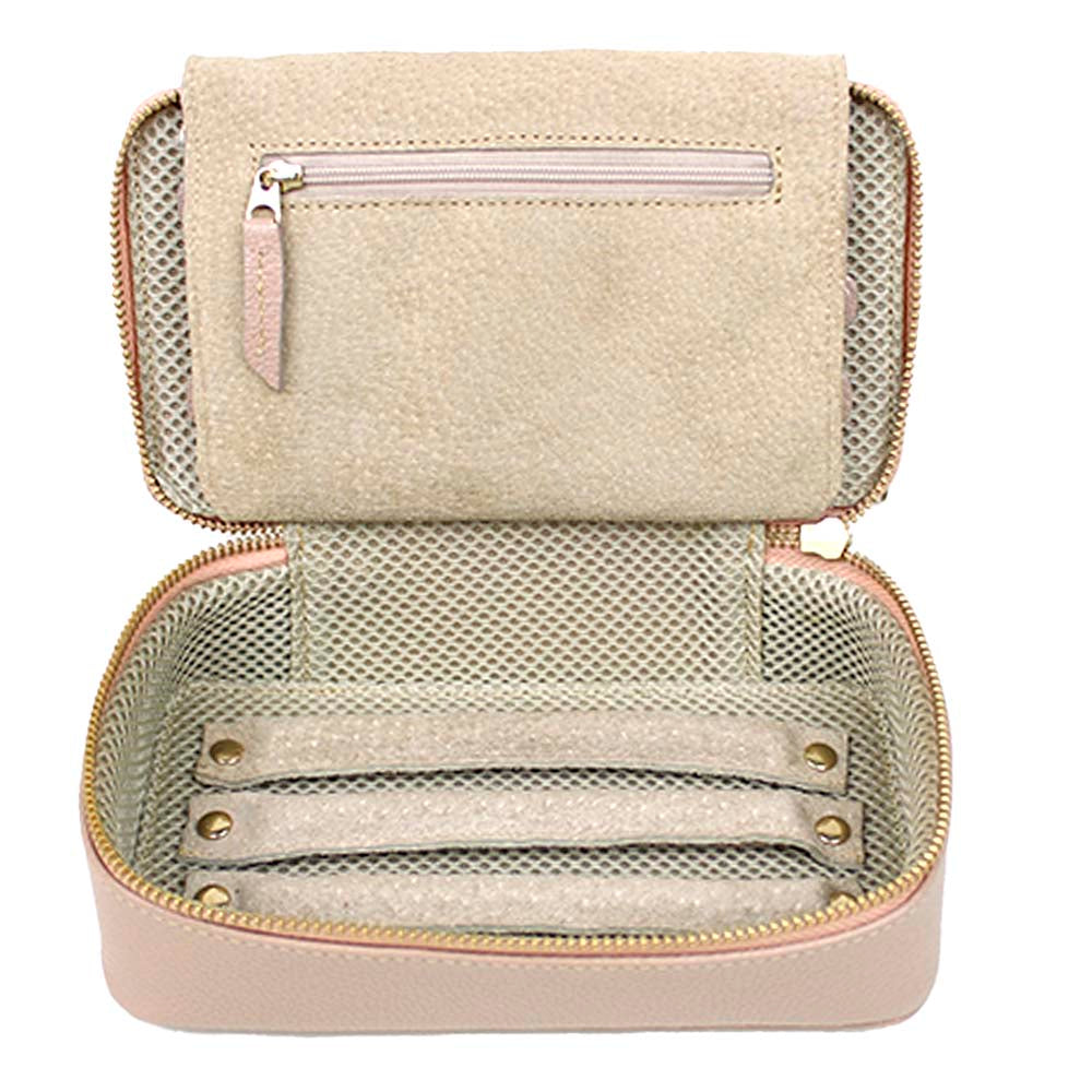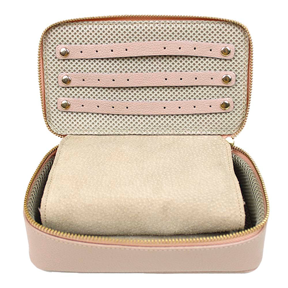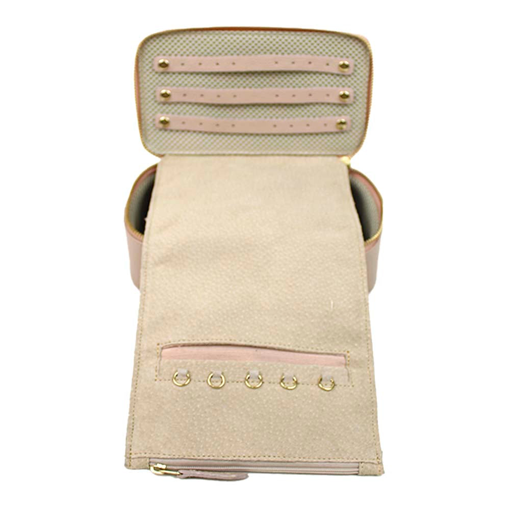 O porta joias Lourdes é ideal para quem gosta de carregar mais joias! É super prático e compacto. Comporta até 12 pares de brincos, 24 anéis, tem 5 lugares para correntinhas e mais 3 bolsos com zíper para relógios, pulseiras, colares. Além disso ainda acompanha um cadeado e pode ser personalizado com suas iniciais. É feito em couro 100% legítimo e forrado com tecido especial e camurça.