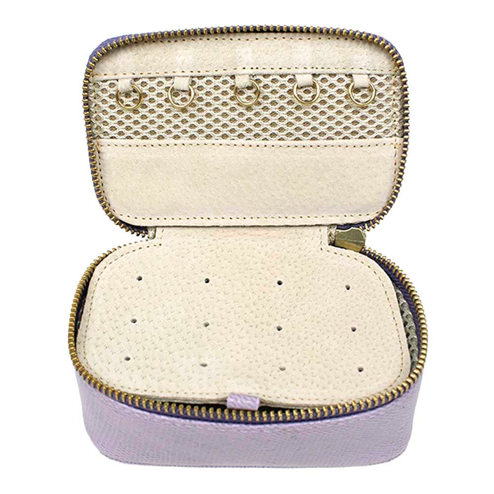 O Porta Joias Helena foi feito para quem gosta de praticidade. É super compacto, ideal para levar na bolsa e em viagens. Possui fechamento com zíper o que garante maior segurança. Possui espaço para 5 colares ou pulseiras, para 6 pares de brincos, tem dois rolinhos para anéis, além de um espaço para alguma peça maior. É todo feito em couro 100% legítimo e pode ser personalizado com as suas iniciais.