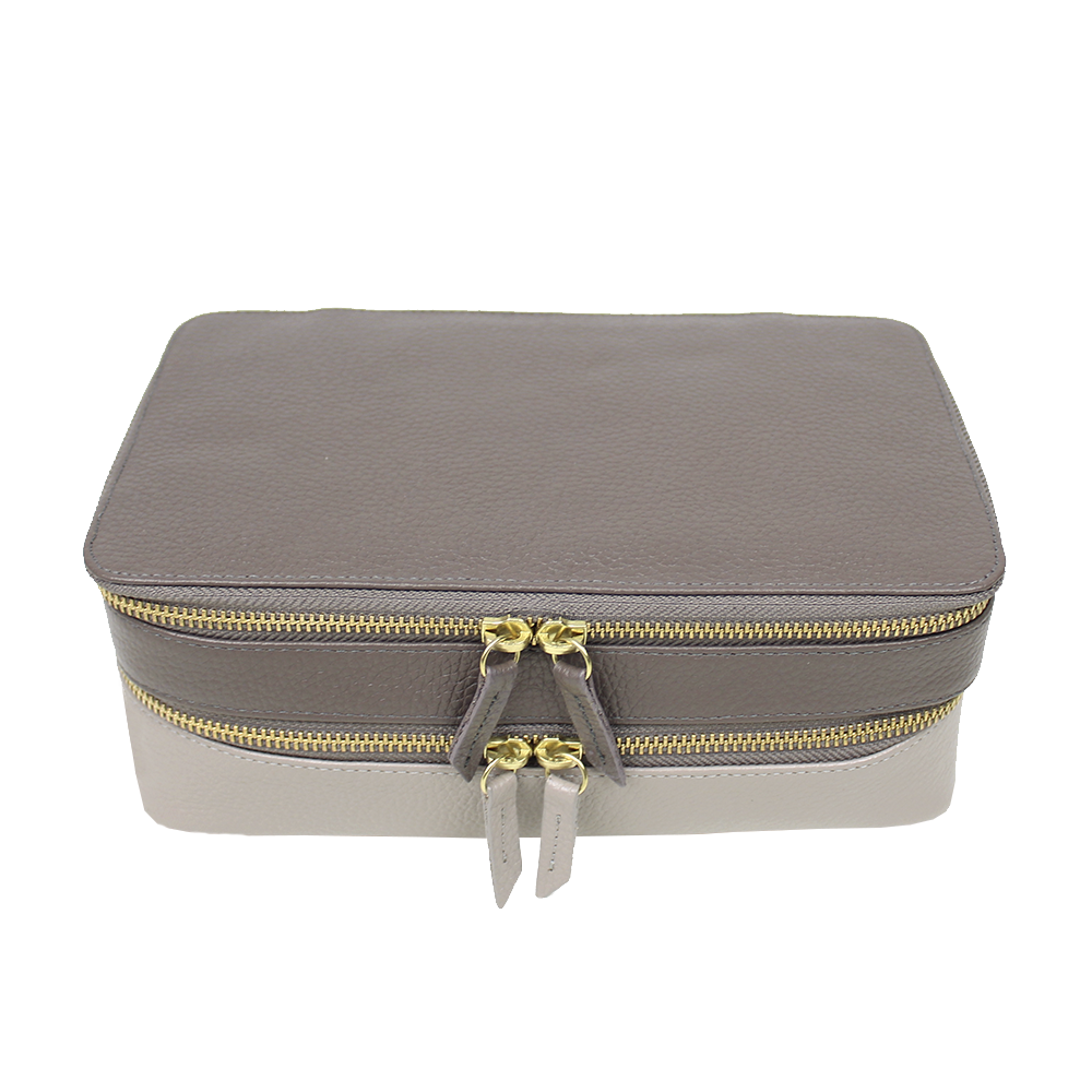 O porta joias Olga é um produto super completo. Todo feito em couro 100% legítimo e camurça, possuiu compartimentos para anéis (média de 30 anéis), para correntinhas, para 25 pares de brincos, compartimento removível para relógios, pulseiras, compartimentos individualizados e transparentes para joias maiores e ainda um bolso com zíper. Pode ser personalizado com seu nome ou com suas iniciais.