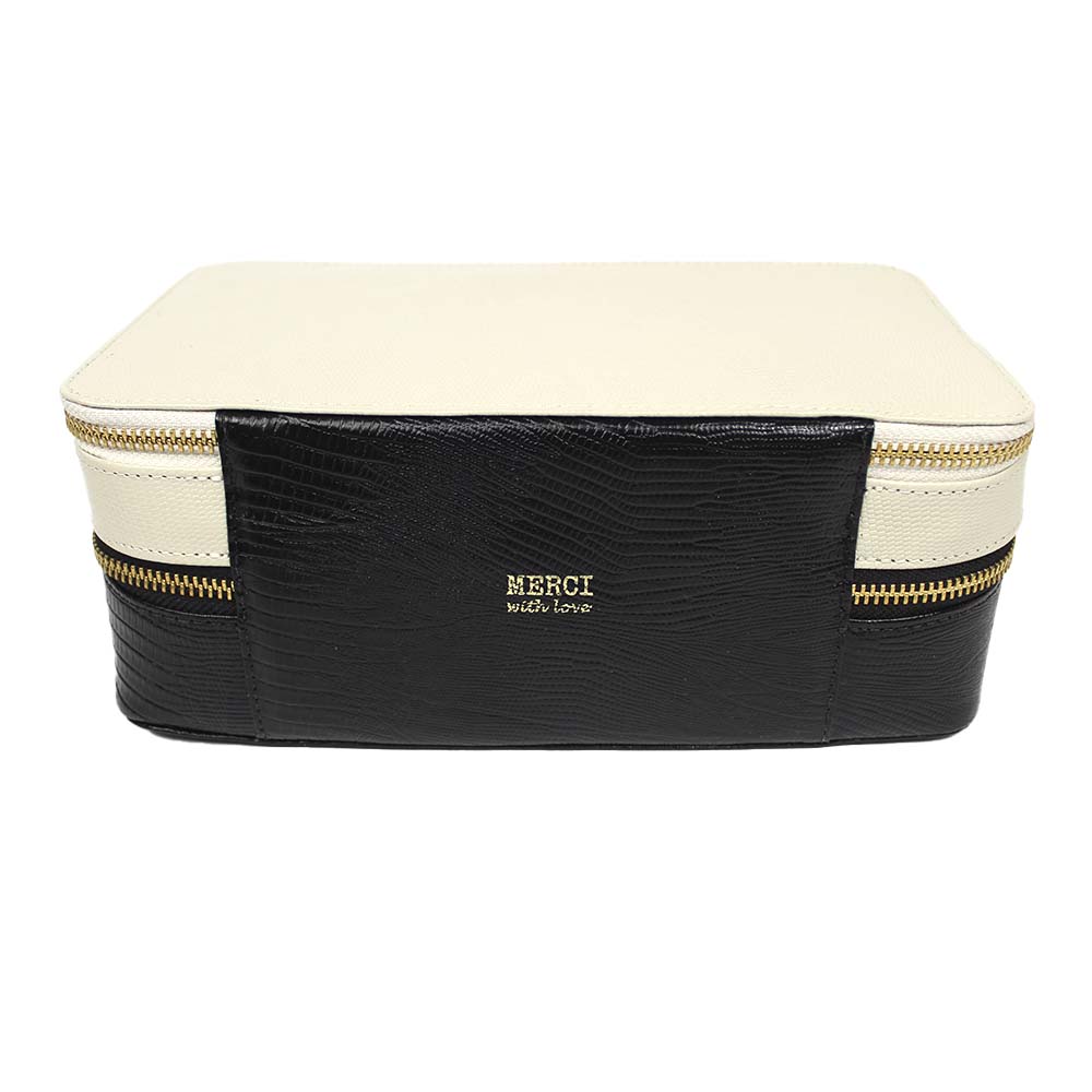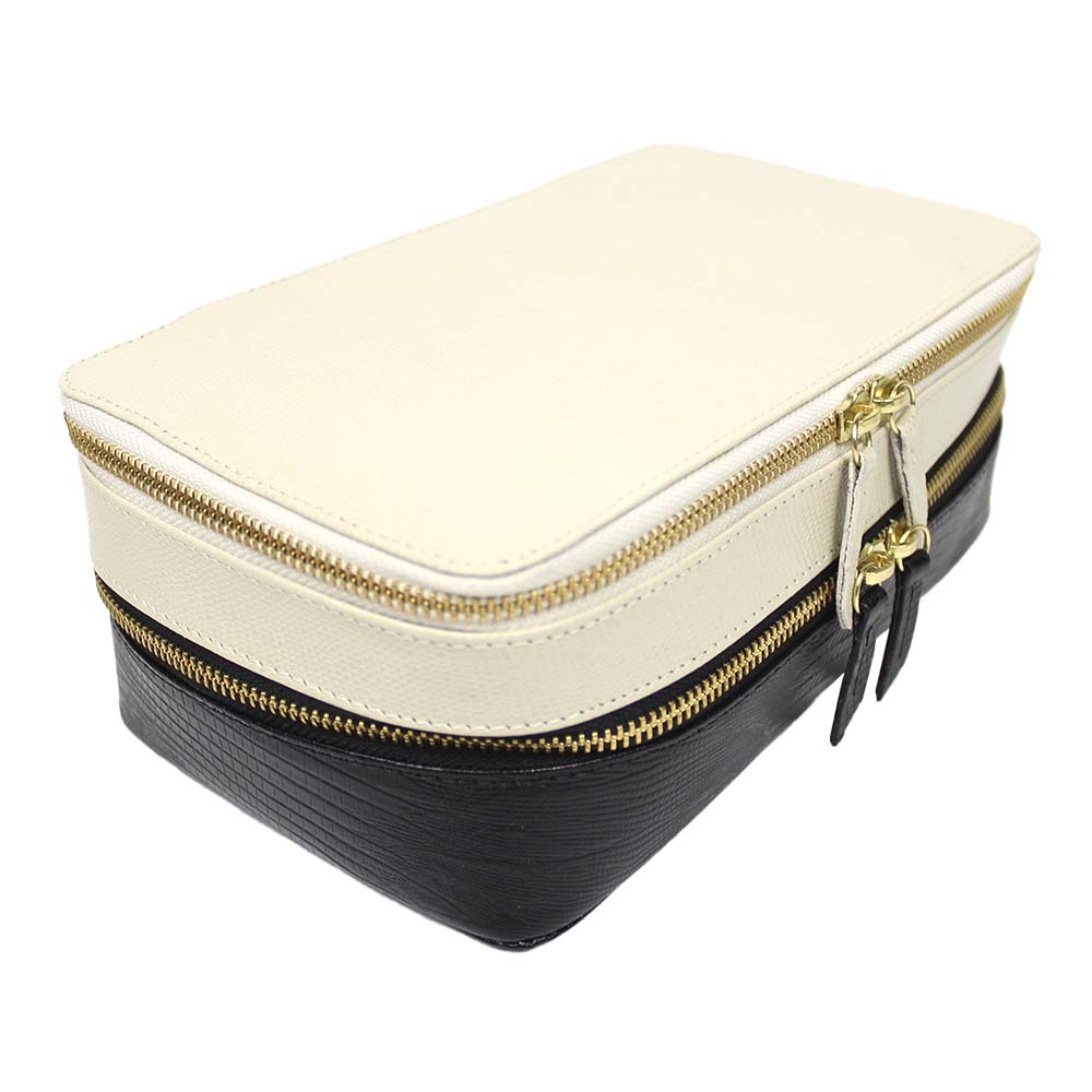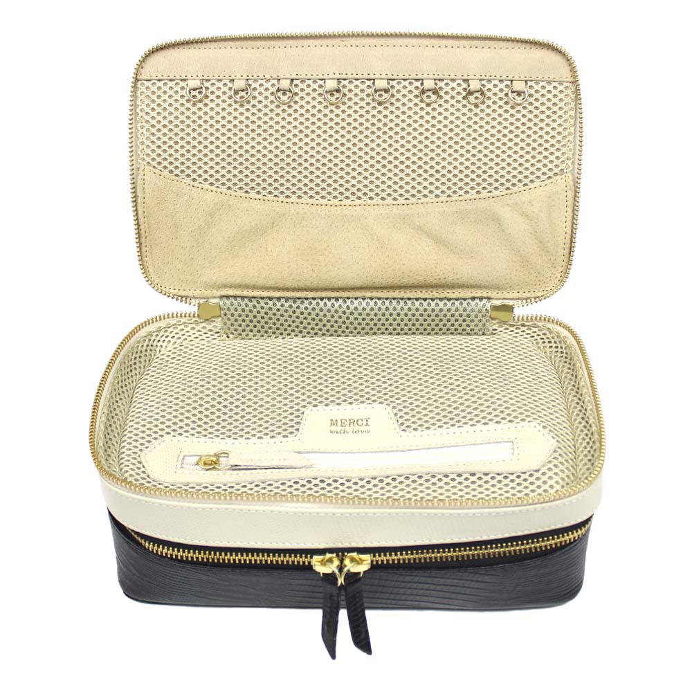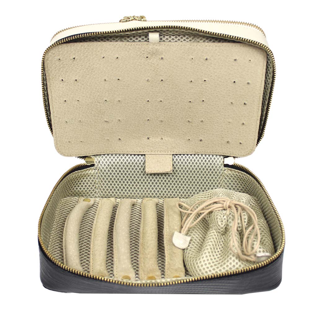 O porta joias Olga é um produto super completo. Todo feito em couro 100% legítimo e camurça, possuiu compartimentos para anéis (média de 30 anéis), para correntinhas, para 25 pares de brincos, compartimento removível para relógios, pulseiras, compartimentos individualizados e transparentes para joias maiores e ainda um bolso com zíper. Pode ser personalizado com seu nome ou com suas iniciais.