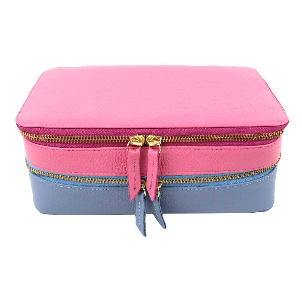O porta joias Olga é um produto super completo. Todo feito em couro 100% legítimo e camurça, possuiu compartimentos para anéis (média de 30 anéis), para correntinhas, para 25 pares de brincos, compartimento removível para relógios, pulseiras, compartimentos individualizados e transparentes para joias maiores e ainda um bolso com zíper. Pode ser personalizado com seu nome ou com suas iniciais.