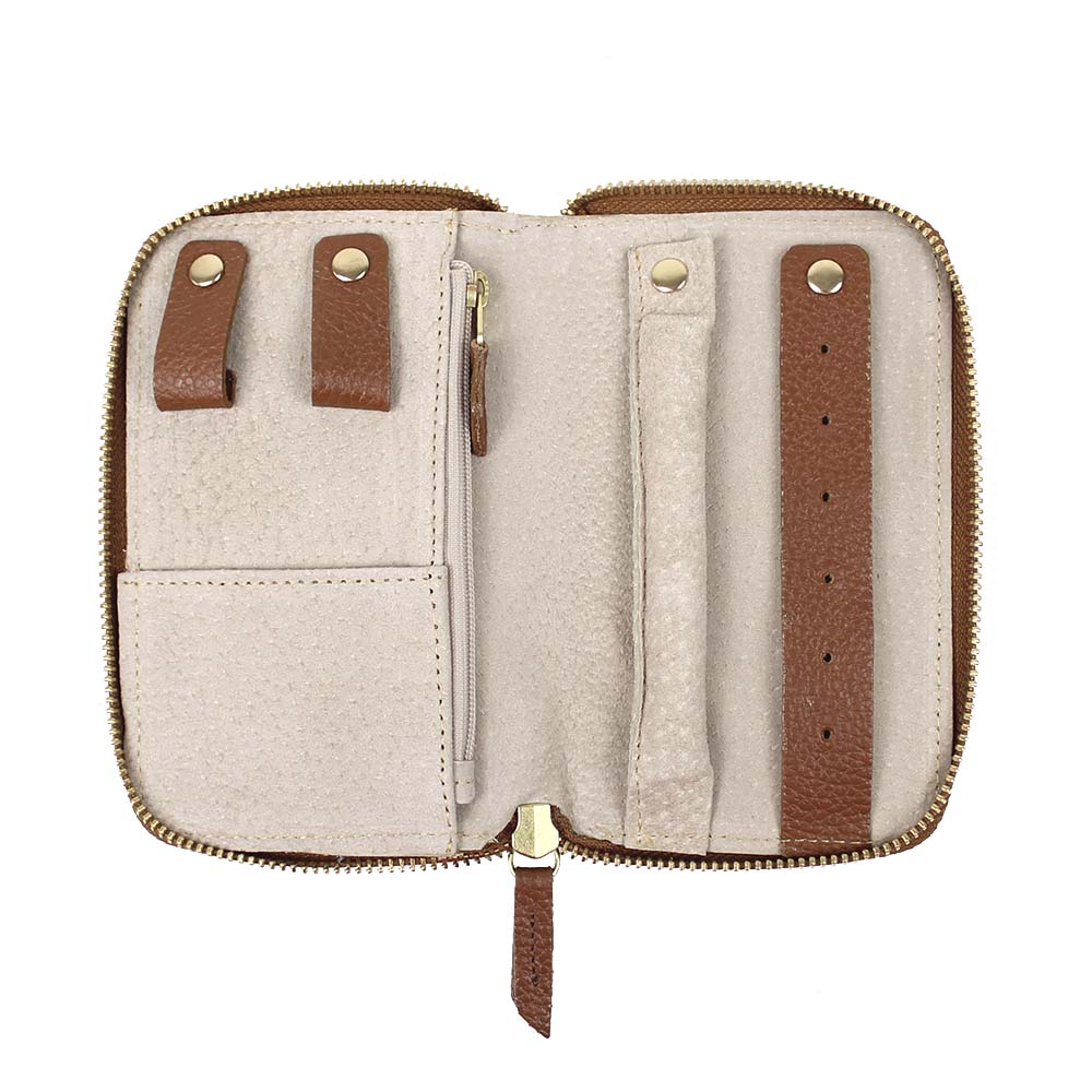 O Mini Porta Joias é todo feito em couro 100% legítimo e internamente todo feito em camurça. perfeito para levar em bolsas e em viagens. possui compartimento para colares, brincos, anéis e um pequeno bolso multiuso e tem fechamento com zíper o que proporciona maior segurança.. tem o tamanho aproximado de uma carteira média de dinheiro.