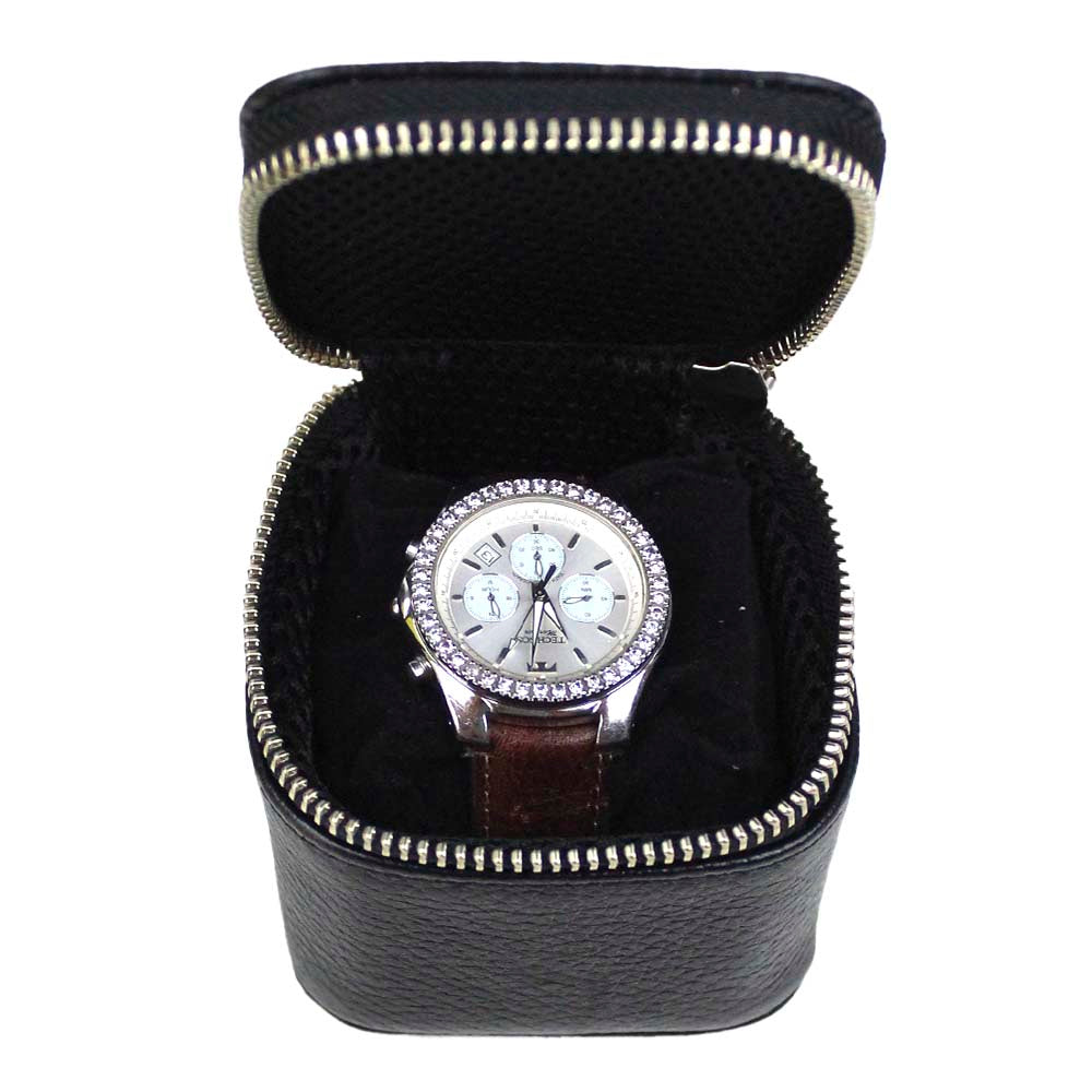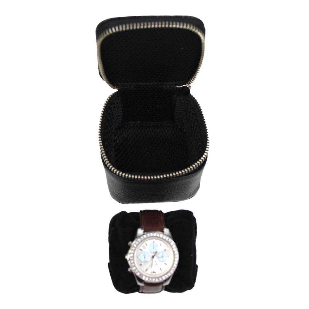 Perfeito para guardar ou transportar com segurança e estilo seu relógio favorito. Todo fechado em zíper e forrado internamente, o Porta Relógio acompanha a almofada para ajudar a preservar a correia do seu relógio. Feito em Couro 100% Legítimo, você ainda pode personalizar com as suas iniciais.