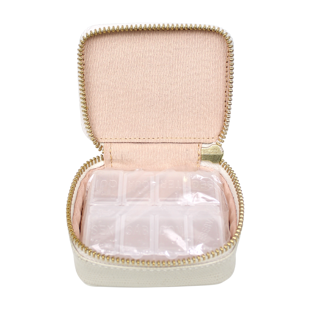 O porta remédios foi desenvolvido para carregar seus medicamentos de forma charmosa e organizada. É todo feito em couro e acompanha caixinha própria para comprimidos, separada por dias da semana. Pode ser personalizado com suas iniciais.
