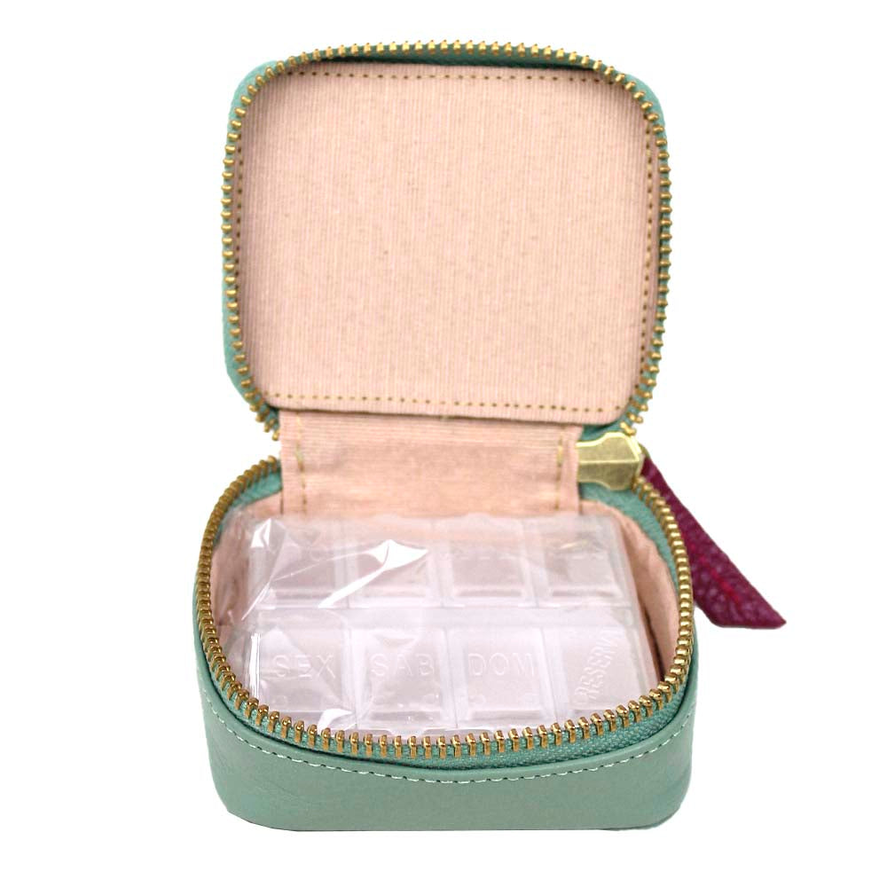 O porta remédio foi desenvolvido para carregar seus medicamentos de forma charmosa e organizada. É todo feito em couro e acompanha caixinha própria para comprimidos, separada por dias da semana. Pode ser personalizado com suas iniciais.